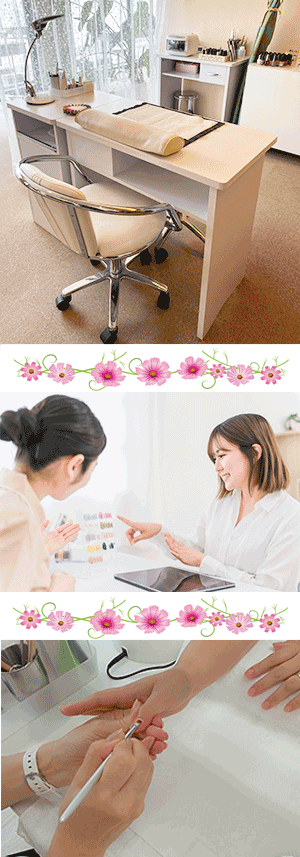 授業は、自分一人に担任講師が1名付く、贅沢な受講スタイルです。学ぶ曜日と時間は、都度担任講師と相談して決める「都度予約制」。自由度100%!落ち着いて自分のペースで学ぶことができるマンツーマンのネイルスクールです。