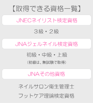 ネイリスト技能検定試験3級~1級、ジェルネイル技能検定初級~上級の取得ができる昼間のコースです。